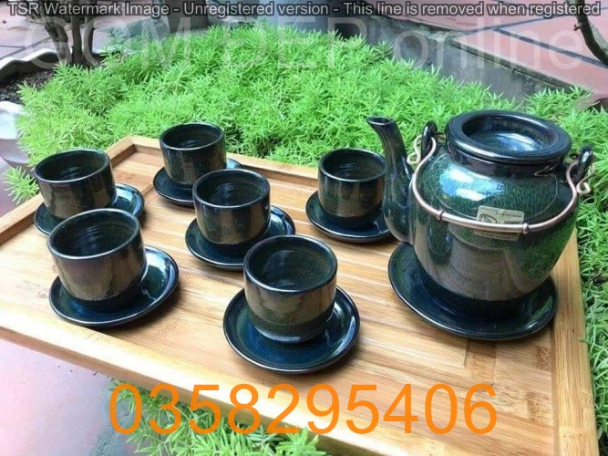 Ấm chén lõm men dá xanh rêu