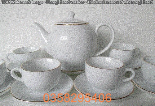Ấm chén trắng kẻ vàng kim