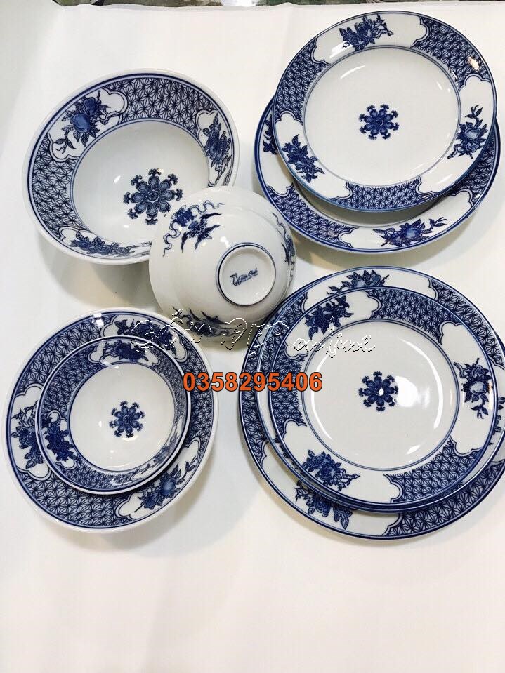 Bộ sản phẩm gồm: Bát chiết yêu các số, Đĩa các phi, bát loe, Đĩa muối