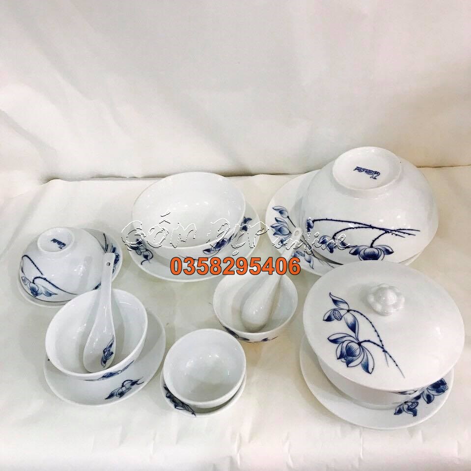 Bộ sản phẩm gồm: Bát cơm, bát mắm, đĩa muối, đĩa f 14, đĩa f 16, đĩa f 18, phạng cơm số 3
