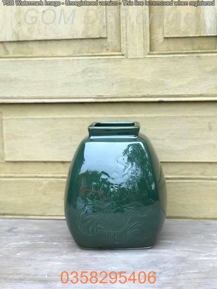 Lọ vuông cao 21cm men rêu khắc sen